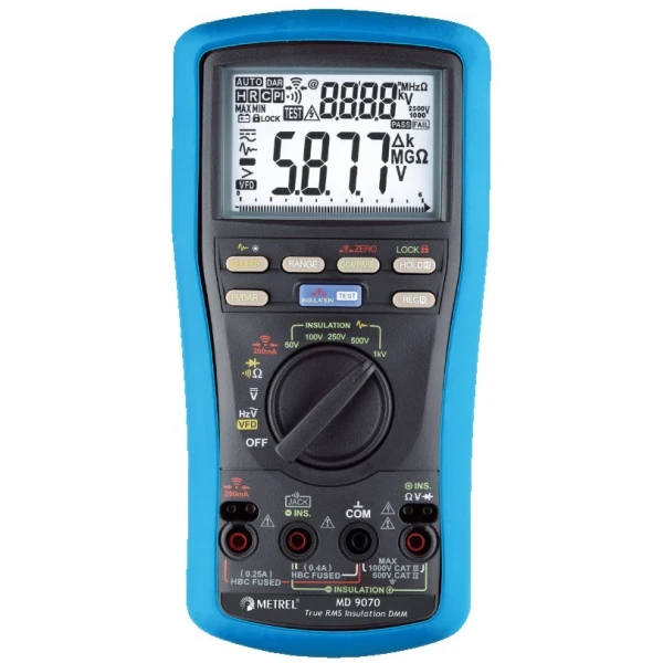 The MD 9070 is a high accuracy continuity and insulation multimeter which may be used in a CAT IV / 600 V environment. It’s dual digital display provides all needed data to the operator while it’s size ensures that it can be operated single handedly. The instrument is equipped with a built-in VFD feature that makes the instrument capable of measuring true RMS values in accordance with frequency, performing PI/DAR measurements and diode test. The MD 9070 has a wide range of extra features, including data hold, memory, min / max, differential, auto power off, auto-ranging, frequency filter, lock feature, reset, relative function and more.
